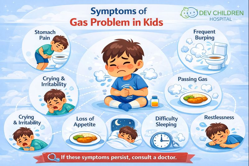 Gas problem occurs when excess air gets trapped in the stomach or intestines. This trapped air causes bloating, pressure, and pain in the abdomen. Children may feel uncomfortable, cry frequently, or complain of tummy pain.